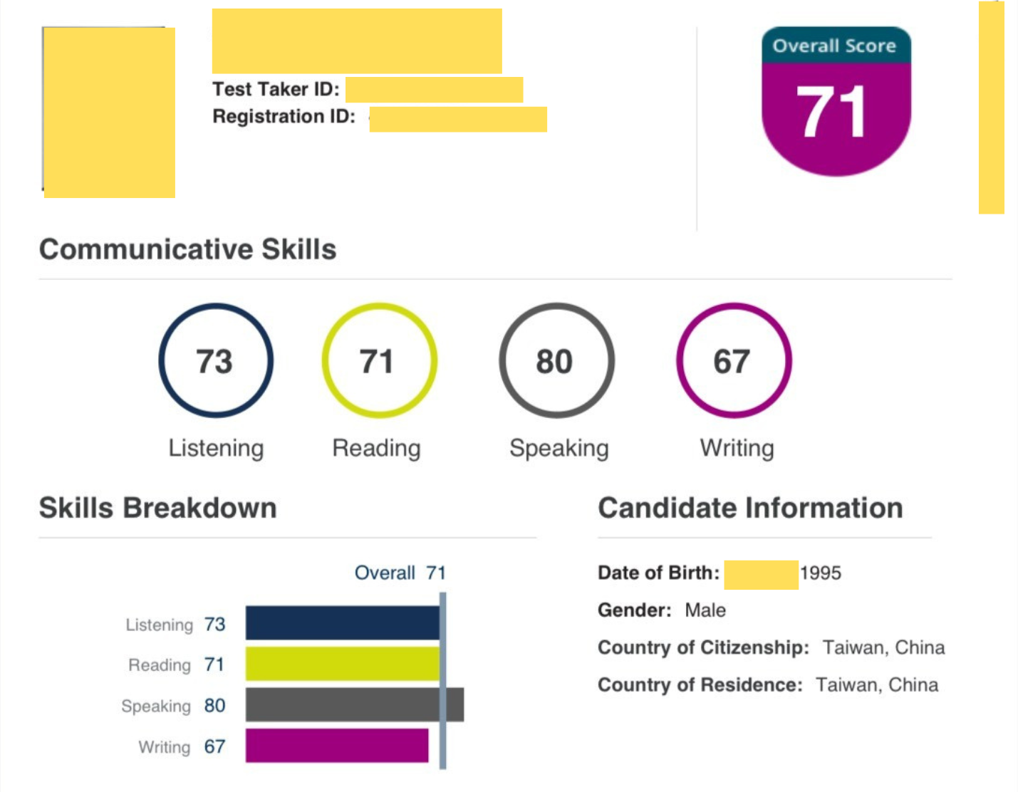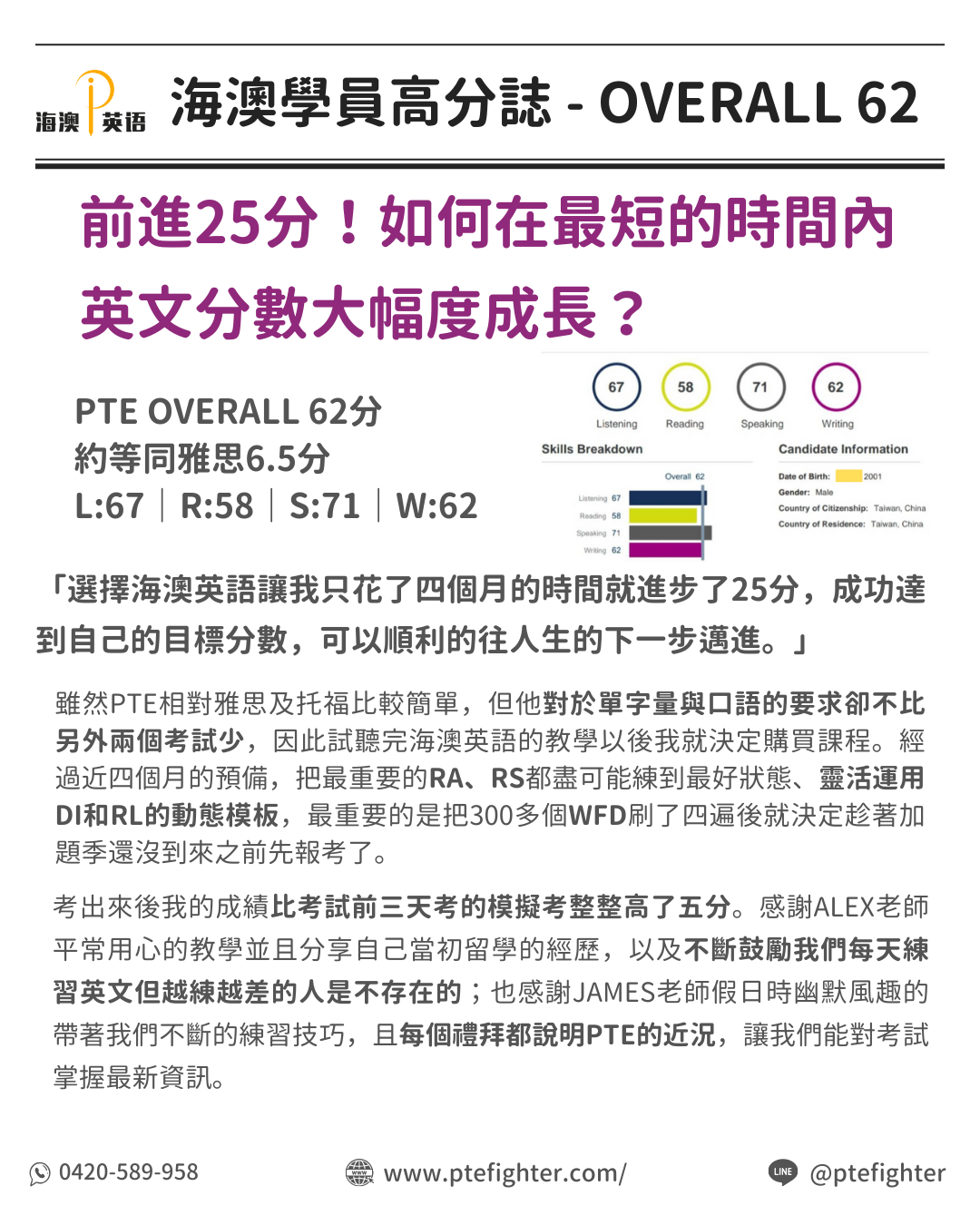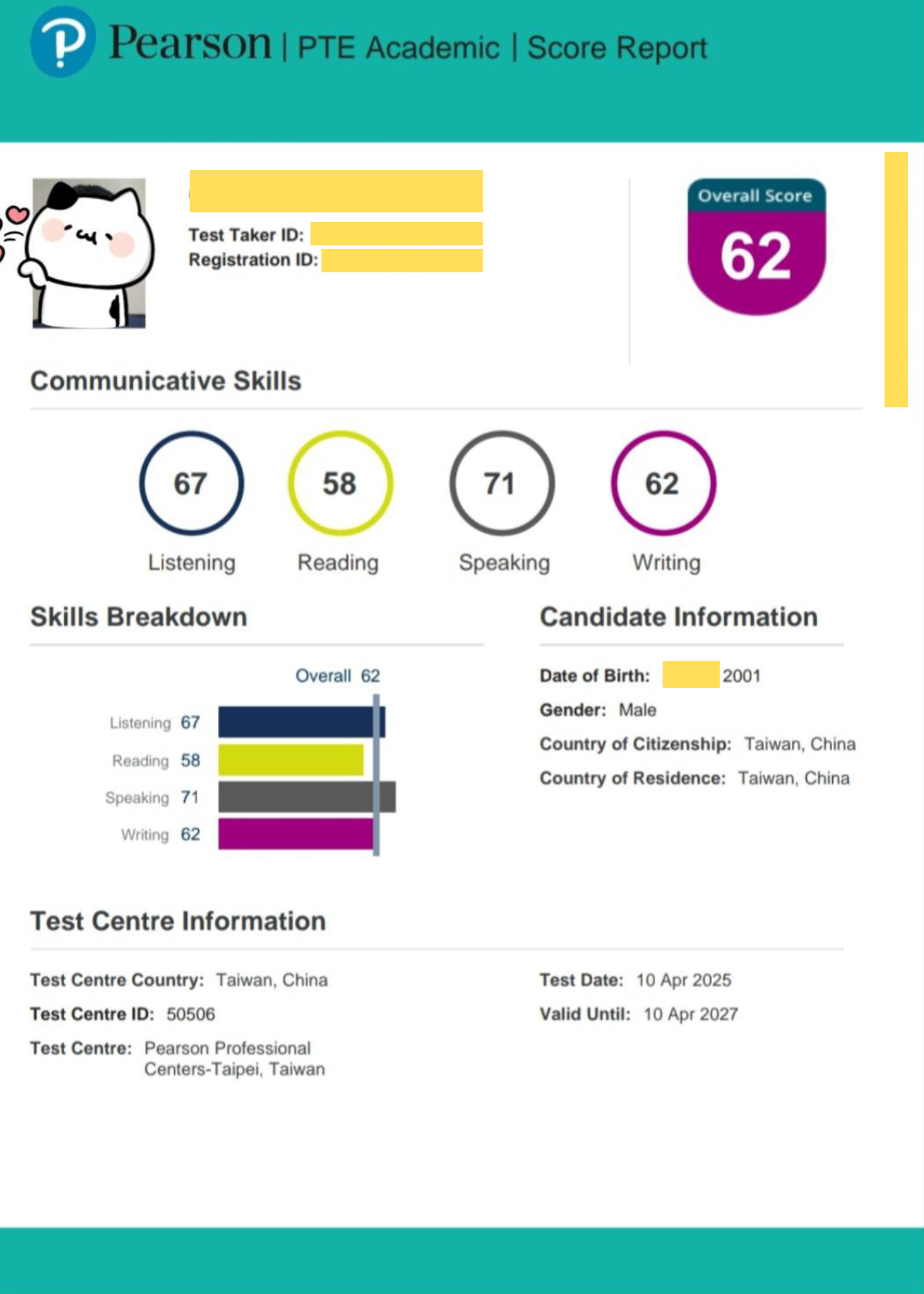考出來後我的成績比考試前三天考的模擬考整整高了五分。感謝Alex老師平常用心的教學並且分享自己當初留學的經歷,以及不斷鼓勵我們每天練習英文但越練越差的人是不存在的;也感謝James老師假日時幽默風趣的帶著我們不斷的練習技巧,且每個禮拜都說明PTE的近況,讓我們能對考試掌握最新資訊。