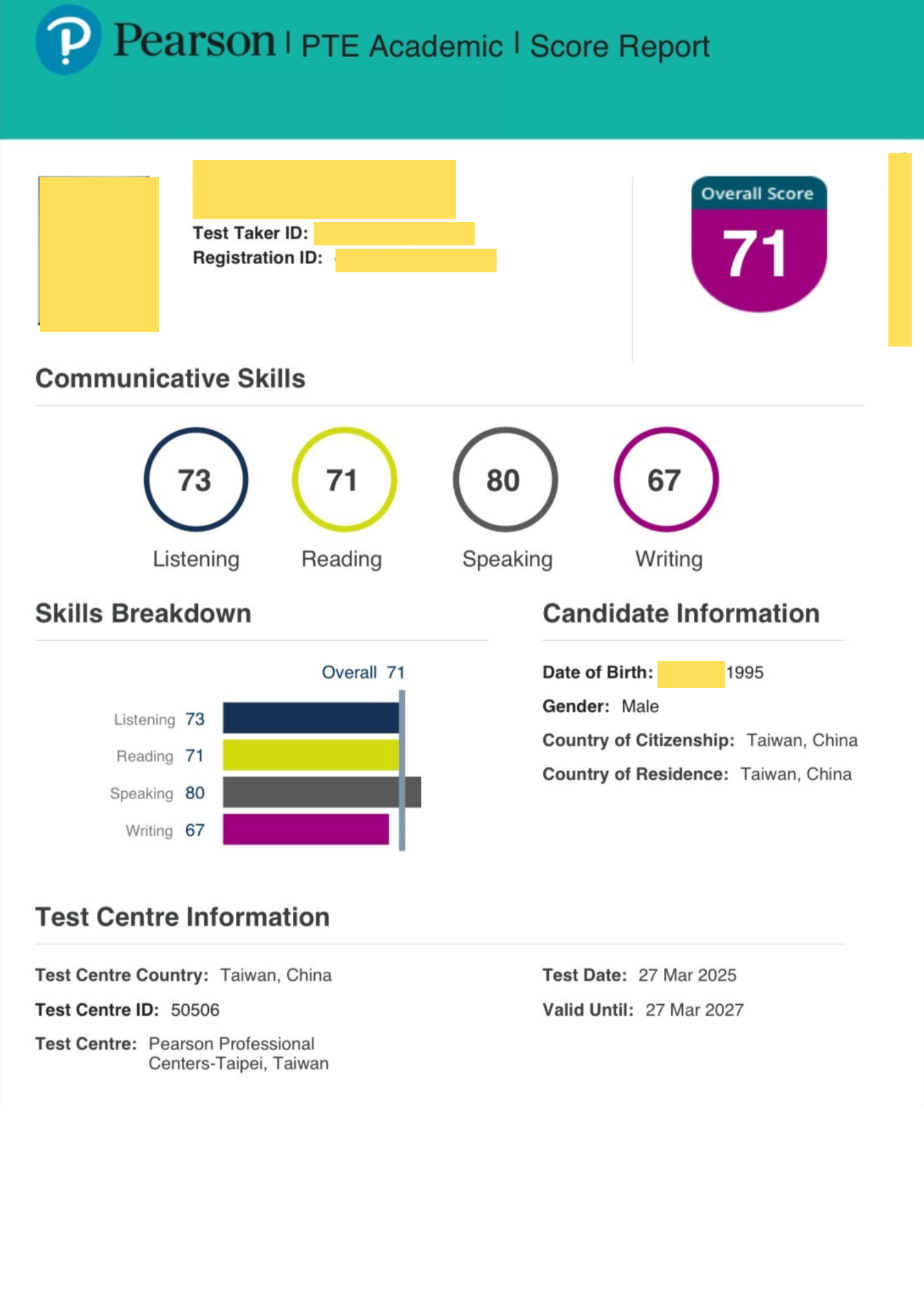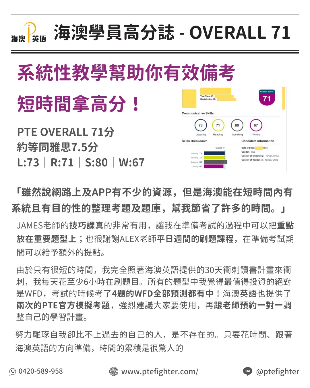 PTE overall 71分,約等同雅思7.5分