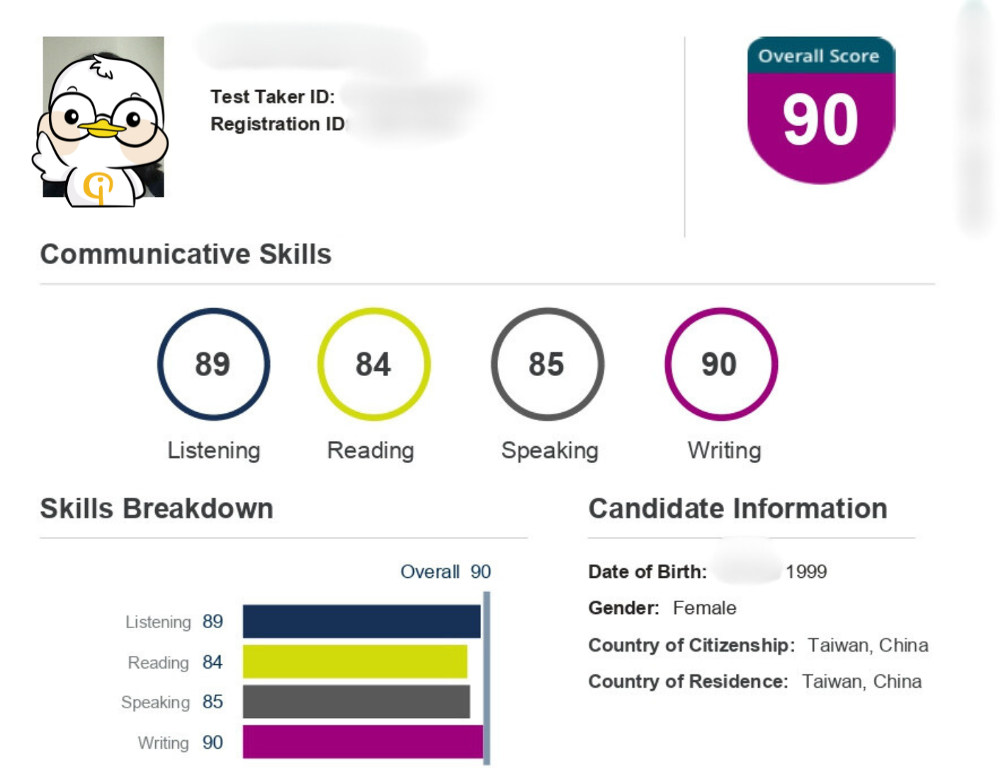 Listening:89|Reading:84|Speaking:85|Writing:90