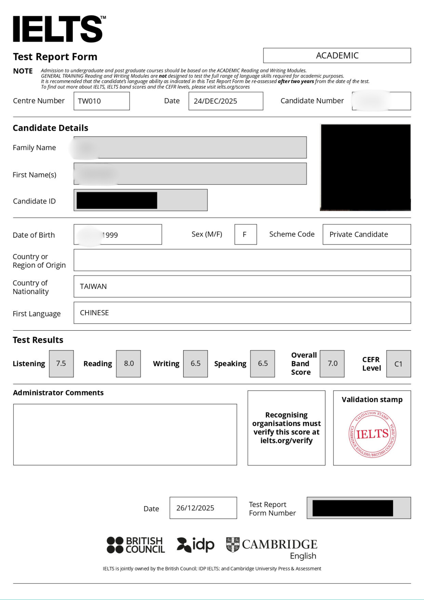 約等同雅思Listening:9|Reading:9|Speaking:7.5|Writing:8