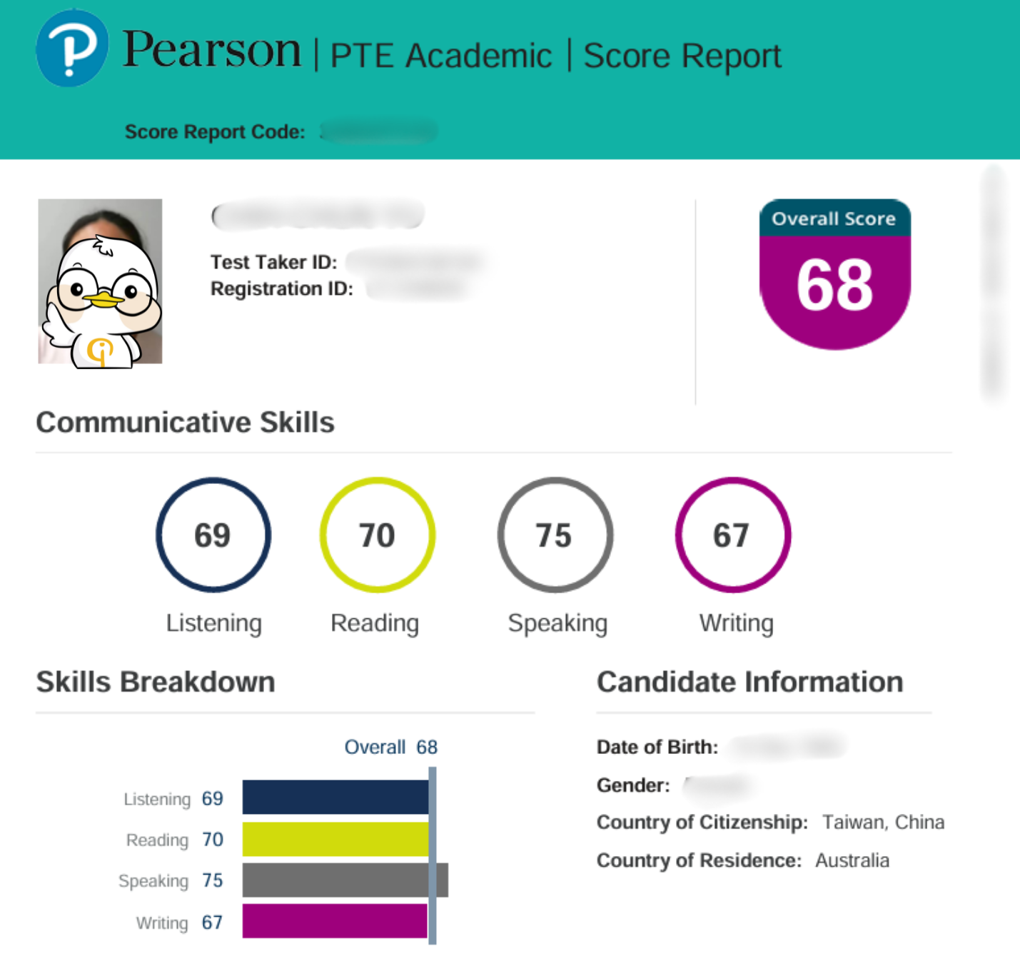 考試過程中,口說都是說完直接送出,先前自己練習寫作時常常發生拼錯字的情形,因此考試時檢查到最後一秒,都在找有沒有打錯字,聽力也適時地留了時間給WFD,雖然最後一題口音超重幾乎聽不懂,但好險也是海澳預測題庫中的題目,才能靠著印象把整句打出來並把試錯打好打滿,結果考試成績出乎預料的好,感謝海澳讓我少走彎路,對簽證的英文資格無後顧之憂!